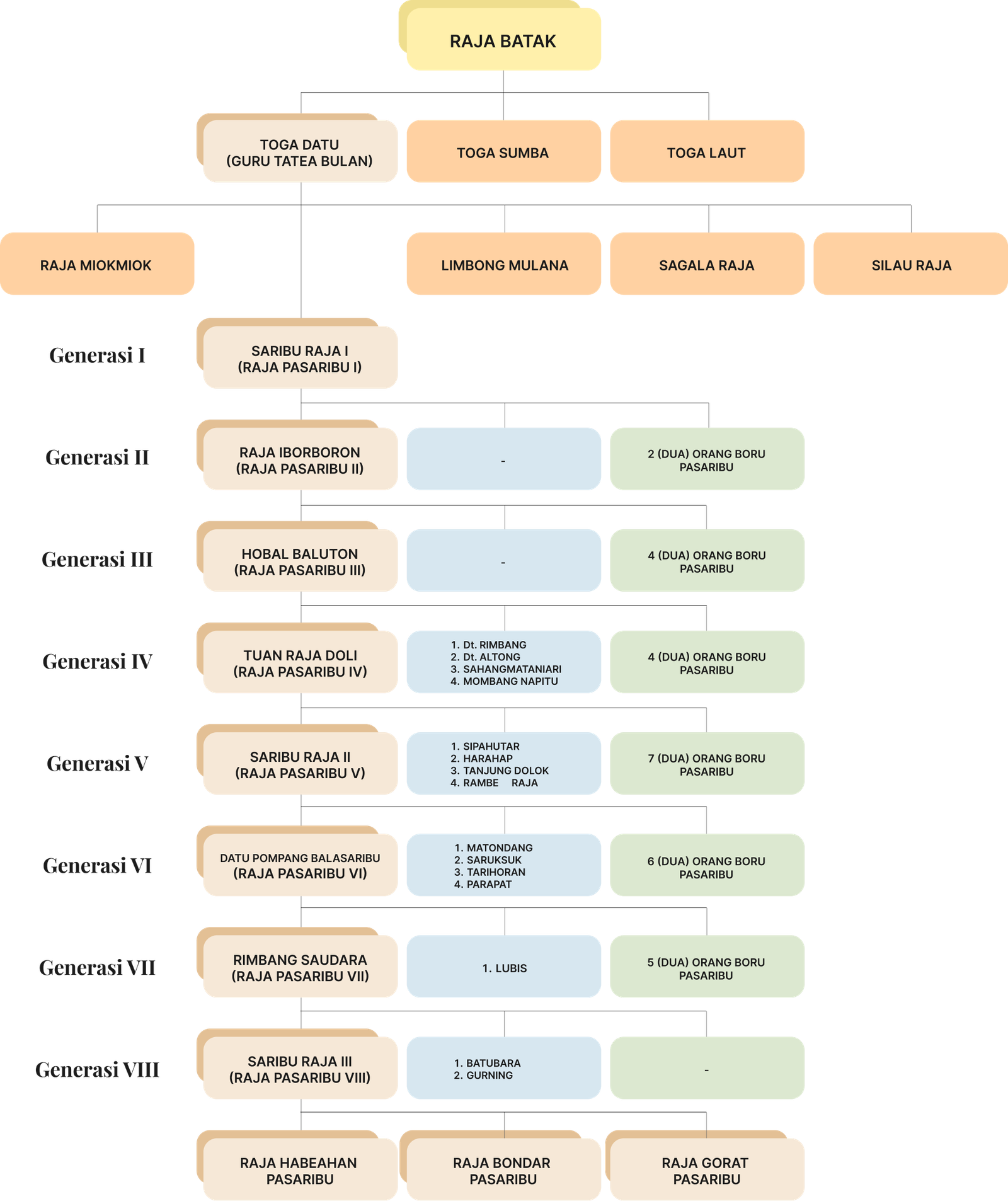 Tarombo merupakan bagan silsilah yang menggambarkan garis keturunan Raja Pasaribu dari generasi ke generasi. Bagan ini disusun untuk menjaga nilai-nilai budaya Batak serta mengenalkan kembali asal-usul marga Pasaribu kepada generasi penerus. Melalui Tarombo ini, diharapkan setiap keluarga dapat memahami posisi dan hubungan dalam ikatan kekeluargaan yang diwariskan secara turun-temurun.